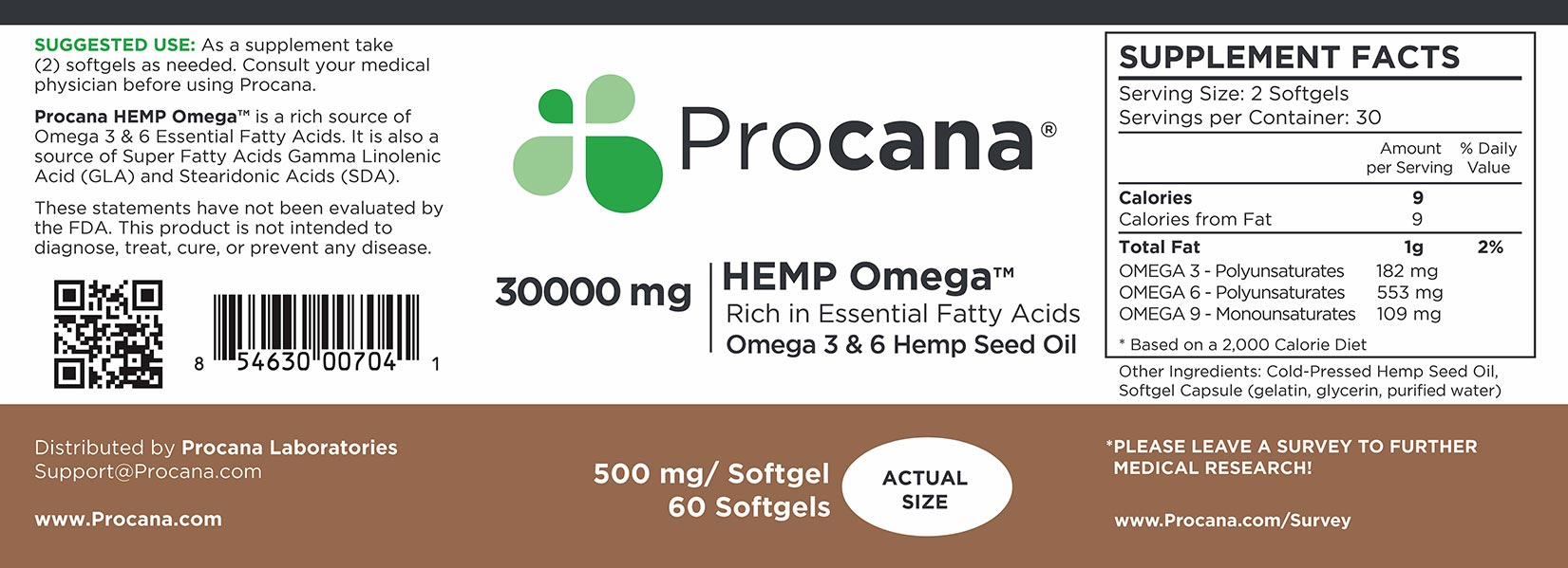 • Ingredients: Softgel Capsule (gelatin, glycerin, water), Cold-Pressed Hemp Seed Oil
