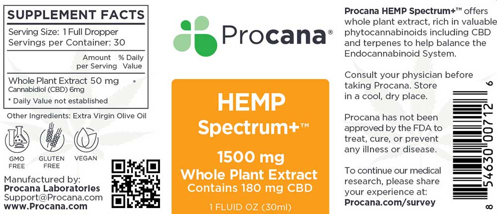 Hemp Spectrum+ contains 50 mg of whole plant Hemp extract with 6mg of CBD (per serving), and rich in other phytocannabinoids and terpenes infused with Hemp Seed oil. Each bottle contains 1500 mg.